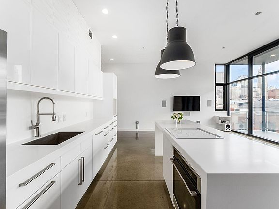 This bright, over-sized unit provides comfortable, stylish living. Its space is defined by openness, featuring 12 foot ceilings, a wall of floor-to-ceiling windows, fresh white paint and a modern mix of building materials including the original cement blocks, polished concrete floors, and amazing new counters!