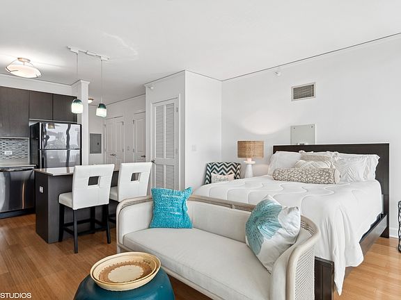 Enter your new Aqua studio with panoramic views of Lake Michigan extending from your large, wave-shaped balcony. Freshly painted walls compliment beautiful bamboo hardwood floors throughout. This condo is bright and open, with floor-to-ceiling windows overlooking the beautiful blue hues of Lake Michigan. Situated on the seagull flight path, watch these birds soar by over the Chicago River and onto the Lake. Plenty of closet space (3 large closets in total!) w/additional storage unit included in price, in-unit washer/dryer. Lovely and updated kitchen with lots of cabinet space, lovely center island - perfect for dining/entertaining, Snaidero cabinetry, and quartz countertops. Rental parking available in heated garage, w/electric spaces available. The Aqua building is an architectural icon. Designed by world-renowned Jeanne Gang. Aqua offers some of the most incredible amenities in the city. Multiple indoor and outdoor pools and hot tubs, steam room, sauna, fitness center, business center, movie theatre, beautiful neighborhood park, two paths to the lake/river walk, and you're connected to the Pedway!