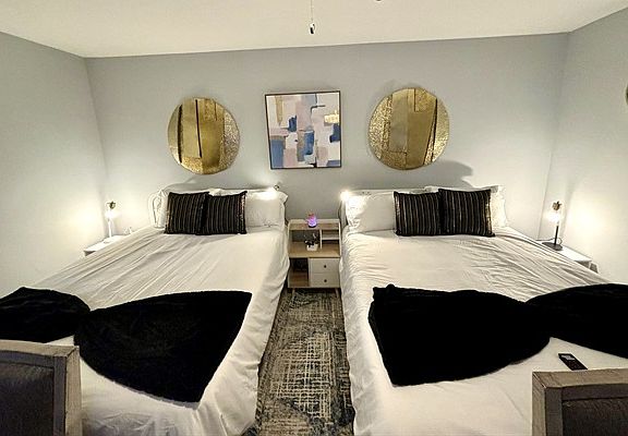 Indulge in comfort in this second master suite, boasting 2 queen beds with reading lights and a sleek, tiled en-suite bathroom. The calming decor and ambient lighting make it a perfect spot to unwind. -There's also an office space with a desk for those needing to get a bit of work done.
