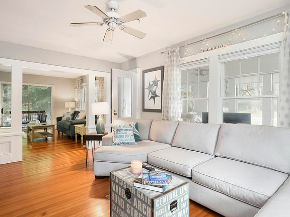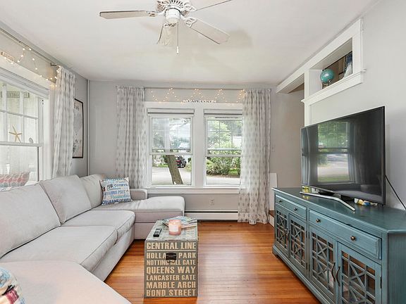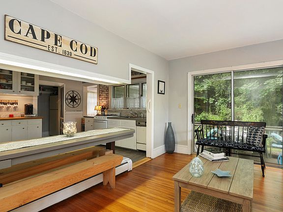 Attractive Cape Cod style home in a premier Falmouth village location! A glass enclosed front porch adorned with a picket fence is your entry into this delightful property, and the perfect spot for your morning coffee. Step inside to a Kitchen with a custom center island table and walk-in pantry, adjacent to an office, Dining room and a cozy Living Room. There is a Bedroom and full Bath on the main floor too. Two additional Bedrooms with hardwood floors are on the second floor. The exterior offers multiple entertaining areas, with its side deck, large patio spacious yard perfect for your cornhole game and large gatherings. Plus, a detached 1-car garage/ storage shed. Enjoy an in-town location where you can walk to Main Street shops and restaurants, library, steamship, schools, bike path and more. Move in and enjoy all this home and community has to offer!