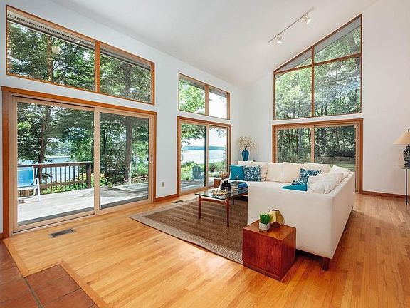 Enjoy Spectacular MILLION DOLLAR WATER VIEWS and daily EAGLE sightings from Contemporary Home! Find your serenity with the beautiful Merrimack River views from your floor to ceiling windows & wraparound 2 yr old mahoghany multi level deck in this private oasis. Adorned by mature plantings, largely surrounded by non buildable Greenbelt land, yet located just 10 minutes from downtown Newburyport's vibrant restaurant scene. Flexible floor plan offers 2 potential bedrooms on the 1st floor and 3 potential bedrooms on the 2nd. Two large rooms on 1st floor have soaring ceilings and abundant space. First time on the market in 37 years, this beauty has been lovingly cared for & maintained. Hardwood flooring throughout 1st floor and tile in the Bonus Room/Studio/Oversized Master. New carpet in the 2nd floor bedrooms. Heat, water & roof in great condition. Large basement, 2 car heated garage & separate Barn on property. Boat/Dock rights /access available w/ permit.