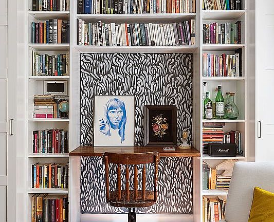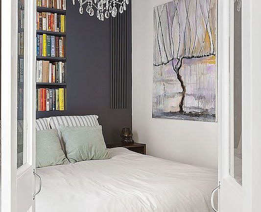 Sunlight fills the living room, highlighting exposed brick, built-in shelving with a desk, and custom French doors. A pull-down projector screen for movie nights completes the perfectly efficient package. The queen-size bedroom offers built-ins and custom nightstands, while the windowed bathroom is newly refreshed with modern fixtures, tiles, and lighting.
