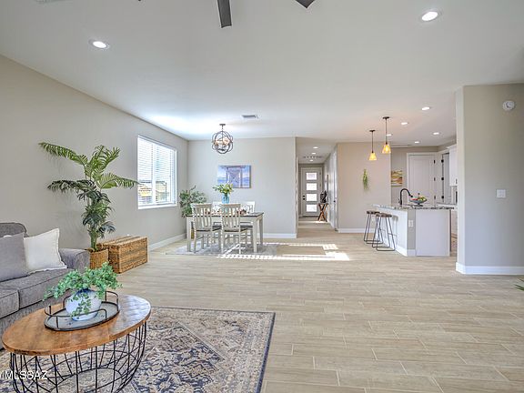 New construction in lovely and peaceful Corona De Tucson. Contemporary Santa Fe style with 3 car garage, added temp controlled storage in garage and so many higher upgrades you'll be impressed! This home is scheduled to finish yet in 2025 in the holiday season. Great room, Open Concept living area will flex to your needs easily. Kitchen will be fully equipped with stainless steel appliances suite, an oversized island with seating and pantry. Granite tops on all countertops. Wood plank tile floors in all main living areas. Wonderful Primary Suite with grand walk in shower and huge walk in closet. Some options may still be customizeable if you hurry! 2 additional lots will begin construction shortly, so if you want to customize with your colors, this can be accomplished!
