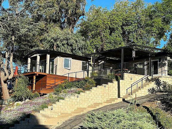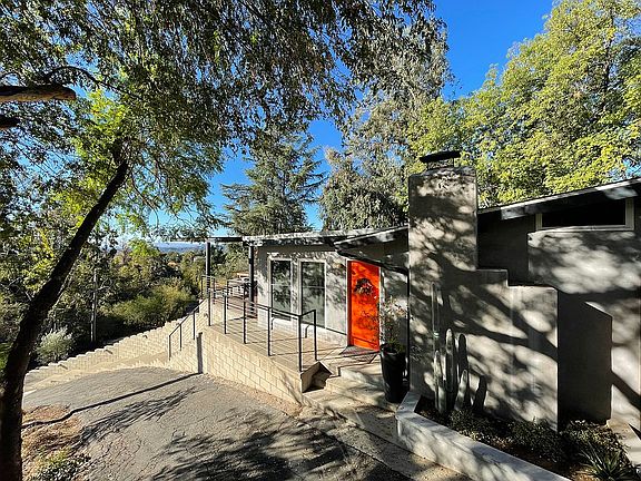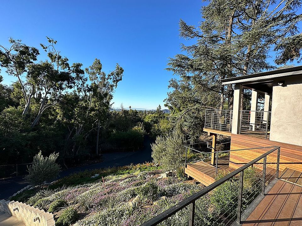 Located off of a private road with city views, this spacious 3 bedroom, 3 bathroom updated Ranch Style home with a Mid-Century Modern twist is in a super-serene setting with multiple front decks with views of trees & the city as well as a great rear patio yard complete with outdoor kitchen, dining area and fire pit.