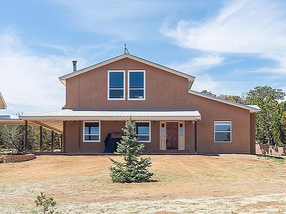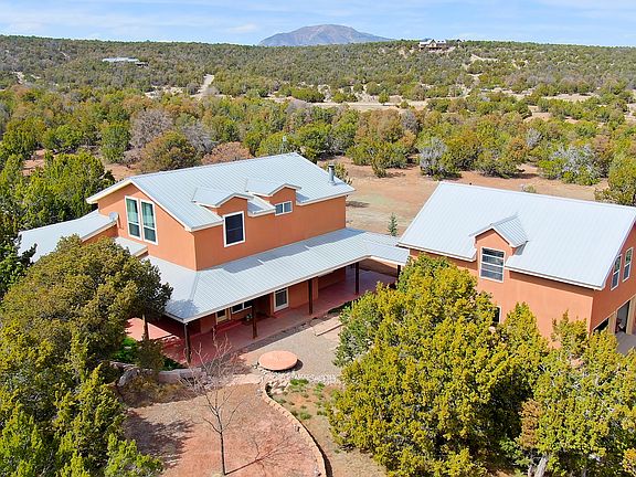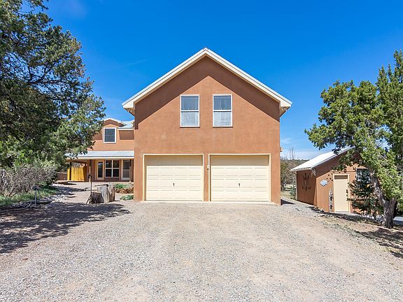 EXCEPTIONAL one owner custom home perfectly nestled among pinons & junipers on 4.89 wooded acres, entirely fenced & gated in Edgewood, NM! Serenity & peaceful surroundings abounds with a wildlife corridor! Take in the views & out door living from 3 porches surrounding the home. Delightful kitchen with an abundance of custom cabinetry, granite counter tops, cook top, Bosch dishwasher & dining area with wall of windows! Generous living room w/wood burning stove! Main floor master suite & sitting room! Barn doors open to the deluxe bathroom with garden tub, shower & walk-in closet! Main floor bedroom & full bathroom! Upstairs: Large loft, 2 bedrooms & full bathroom! Heated 590 sq ft office/guest room & 3/4 bathroom located in the 2 car garage! An AMAZING 902 sq. ft. garage...and MORE...!