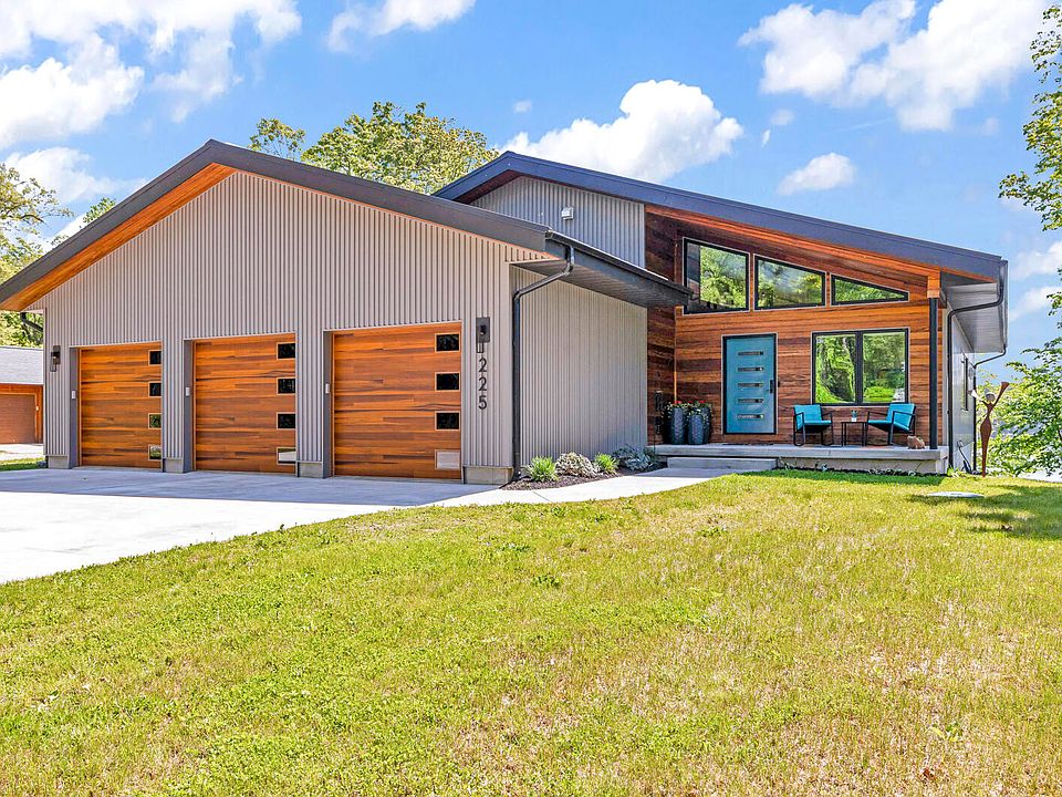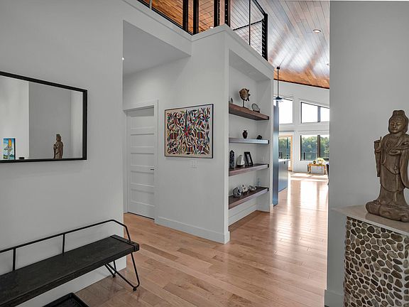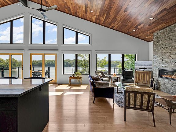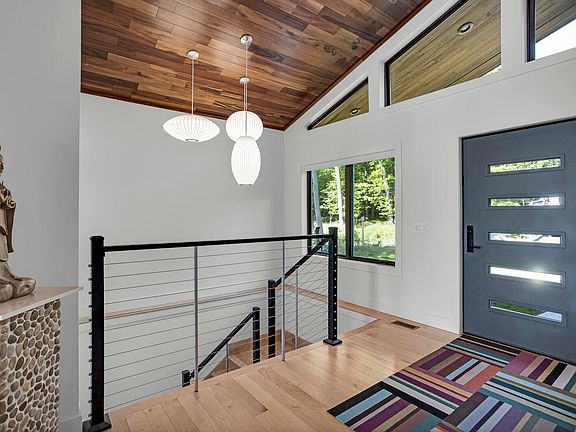This Mid-Century Modern inspired home offers 75' of prime lake frontage on the private and picturesque Mirror Lake. Industrial and natural elements blend seamlessly into a zen-like feeling of quiet luxury. The Kitchen features top of the line Viking appliances, custom Wenge wood Omega cabinets, Dolomite countertop, and a clever pantry/appliance garage. Gorgeous primary bedroom ensuite w matte slipper tub & custom glass shower, multi-zoned heated floors, and a show stopping tigerwood ceiling spanning the entire main level. Closets all feature custom built-ins. Lower level second kitchen, huge rec space, and a relaxing Sauna. Additional features - triple paned UV coated windows, air exchanger, RO water system, Eljen septic system, heated garage floors all w Spectacular Views! A Must See!