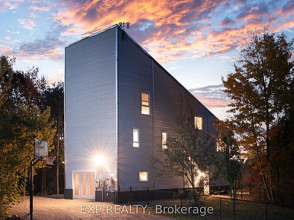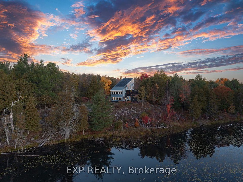 **Luxury Meets Sustainability** Set on 25 acres of private forest, granite, and protected spring-fed ponds/wetlands, this modern architectural home blends luxury living with complete energy flexibility. Built in 2014 and upgraded in 2024 with a premium solar array and Growatt battery backup, the home remains fully connected to Hydro at all times. Solar simply offsets your costs-or with an easy phone or laptop app, you can choose to run entirely on solar. It's intuitive, secure, and designed for comfort.The residence stands out with galvanized steel, wood, and black accents. Inside, the upper level features soaring ceilings, hardwood floors, a wood-burning stove, stainless-steel counters, and custom tilework. The primary suite is a true retreat with a massive deep soaker tub overlooking the wetlands and a stunning oversized black-tiled shower. The main level offers a redesigned foyer, new bathroom, and a large fourth bedroom currently used as an office.The land is exceptional: private hiking trails, mixed forest with hardwood you can sustainably harvest, maples ready to tap, foraging areas rich with mushrooms, and quiet water ideal for canoeing directly from the yard. Wildlife is abundant-herons, owls, eagles, deer, beavers, turtles, and migratory birds. A powered insulated Quonset building provides workshop, garage, storage, or studio options, and a fenced dog run adds convenience. With generous acreage and road frontage, there is potential for severance or a second residence (buyer to verify). Despite its privacy, the location is ideal: Tamworth (4 min), Napanee (20), Kingston (30), Prince Edward County (40), Belleville (45). A rare offering where modern luxury, natural beauty, and future-ready living come together.