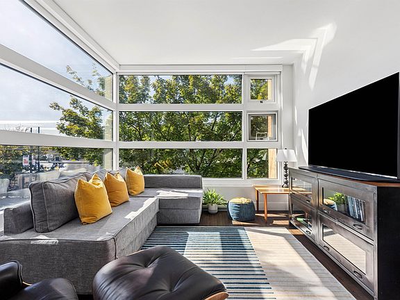 RARE CONCRETE low-rise on the Drive with light, lifestyle, and livability in equal measure. Corner home with 9’ ceilings and a dramatic full-span wall of south & west windows wrapping the living area; no breaks, just all glass and treed outlooks. Automated blinds throughout – bedrooms too! Open-concept plan has great flow: proper dining, large island kitchen with gas range & full-size appliances, & generous living area. Separated bedrooms & an extra-large bathroom with stand-alone soaker tub & shower. Covered 60 SF balcony extends your living. Original owner – never rented. Heat pump installation allowed & EV charging in the garage. Step out to Commercial Drive’s cafés, markets, culture & catch the SkyTrain just a block away. A hip, connected community at your doorstep.