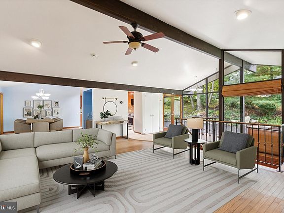 Welcome to this one-of-a-kind mid-century modern home, nestled on a secluded, tree-lined street in the highly sought-after area by Huntingdon Valley Country Club. Offering exceptional privacy, this residence boasts serene, panoramic views from every window. Its stunning wood and glass structure harmonizes with the surrounding natural landscape, providing breathtaking views of the wooded scenery from every angle. Outdoor living is a delight with expansive decks and a spacious screened in area of the deck, perfect for dining al fresco under the treetops. A Few steps down from the main deck you will find a delightful screened-in gazebo. Upon entering, you are greeted by a warm and inviting living room with floor-to-ceiling windows, stone wall gas fireplace (non-vented), sliding glass doors opening to the main deck, Adjacent to the kitchen, the den offers sliders to the patio and a newly updated powder room. The spacious dining room provides ample space for entertaining and dinner parties and is perfectly situated next to the kitchen for easy hosting. The custom kitchen is a showpiece, hand-built by a master carpenter and featuring granite countertops, stainless steel appliances, a built-in desk, handsome wood cabinets, a sleek glass tile backsplash, a newer stackable washer and dryer in a separate alcove located on main level for your convenience. The open floor plan allows for a seamless flow between rooms, enhancing the spacious and airy atmosphere throughout the home. Solid hardwood floors run throughout, while the living room's exposed beam ceiling and stone wall gas fireplace add warmth and architectural character. Ample closet and storage space ensure both style and practicality. The main level also includes the primary bedroom, which features a full bath and 2 spacious closets. The lower level offers a cozy sitting area with ceramic tile floor, sliders leading to the lower deck, along with two additional bedrooms and a versatile bonus room that can be used as an office, fitness room, or extra living space. Completing the lower level is a full bathroom, laundry room/storage room and access to an attached 2 car garage. This home effortlessly blends style, function, and comfort in a tranquil and picturesque setting. All rooms on the main level have sliding glass doors to the deck/outdoors. Easy to show. Immediate possession is possible. .