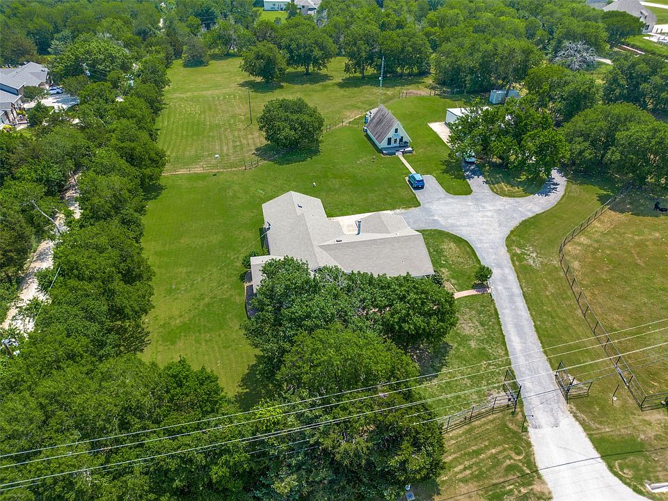 Prime location! Over five picturesque acres nestled in the heart of Lucas within the highly coveted Lovejoy ISD. This custom-built home features three bedrooms, two bathrooms, and a concrete basement. The family room, open to the kitchen and breakfast area, is ideal for gatherings. An inviting sunroom adjoins the family room, perfect for morning coffee or relaxation. Additionally, the property boasts an A-Frame guest house complete with kitchen and laundry facilities. A spacious workshop is equipped with a gas heater and plumbing for a bathroom. The grounds include a covered two-stall shelter, over five acres of breathtaking land with mature trees, a creek, two wells, and ample space for horses or livestock. Experience the best of country living with city amenities just a short drive away. The property exudes country charm and offers limitless potential, all without the constraints of an HOA.