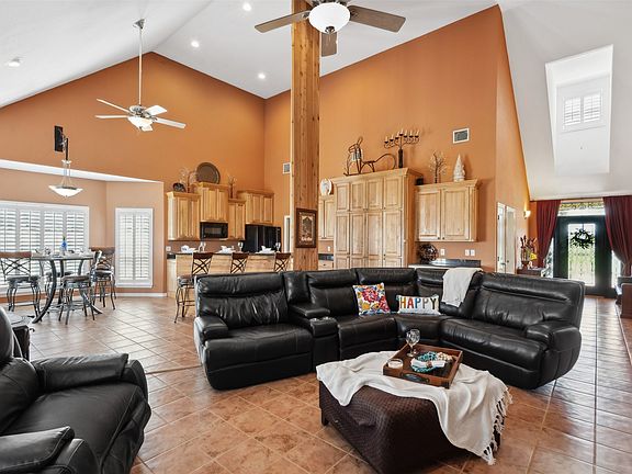 On over 7 acres of serene countryside, this fully fenced property offers privacy, space, and all you need for projects, toys or a business. A spring-fed pond enhances the setting as you enter the property, while the Prairie-style home sits atop the long driveway. The home offers a warm welcome with its open floor plan. Tile floors span the home, and plantation shutters let the light in. With 3 bedrooms and 2.5 baths the well-planned layout is comfortable. The third bedroom, currently used as an office, features a built-in Murphy bed for added functionality. The heart of the home is the kitchen, which opens to the living room with 19-foot ceilings and custom cabinetry. The kitchen is equipped with a large built-in pantry which is almost hidden and adds great storage. For those who value storage and workspace, the property features two large shops. The first, approximately 2,000 square feet is 70x26, includes six car bays and a 200-amp service, perfect for automotive projects. The second shop, measuring 50x40, is equally impressive with an air-conditioned craft room, workout room, bathroom, and laundry space with stackable washer and dryer. A second-level deck adds versatility.