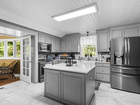 The high-end kitchen includes a farmhouse sink, solid surface countertops, stainless appliances, and a large island for prep and storage. Recent updates include a metal roof and high-efficiency vinyl windows. For your comfort there is the convenience of fuel oil forced-air heat, central air, and a propane heater for the above-ground pool.