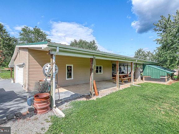 The property has been remodeled throughout the years including drywall, metal roof, windows, and basement dry lock. 1,000 sq ft approximately buyer to verify sq ft. The semi-private setting is not far from Route 15. Some interior features include a breakfast bar, pull-down steps in the garage for extra storage area, backup propane heat, unfinished basement could be finished for more living space. Interior steps lead to the basement. Are you looking for a place to have bunnies or chickens? Has several cages off the patio—a massive patio for relaxing or for bbq's. 1 bedroom 1 bath open floor plan has an additional small room that could be used for an office or walk-in closet, etc.