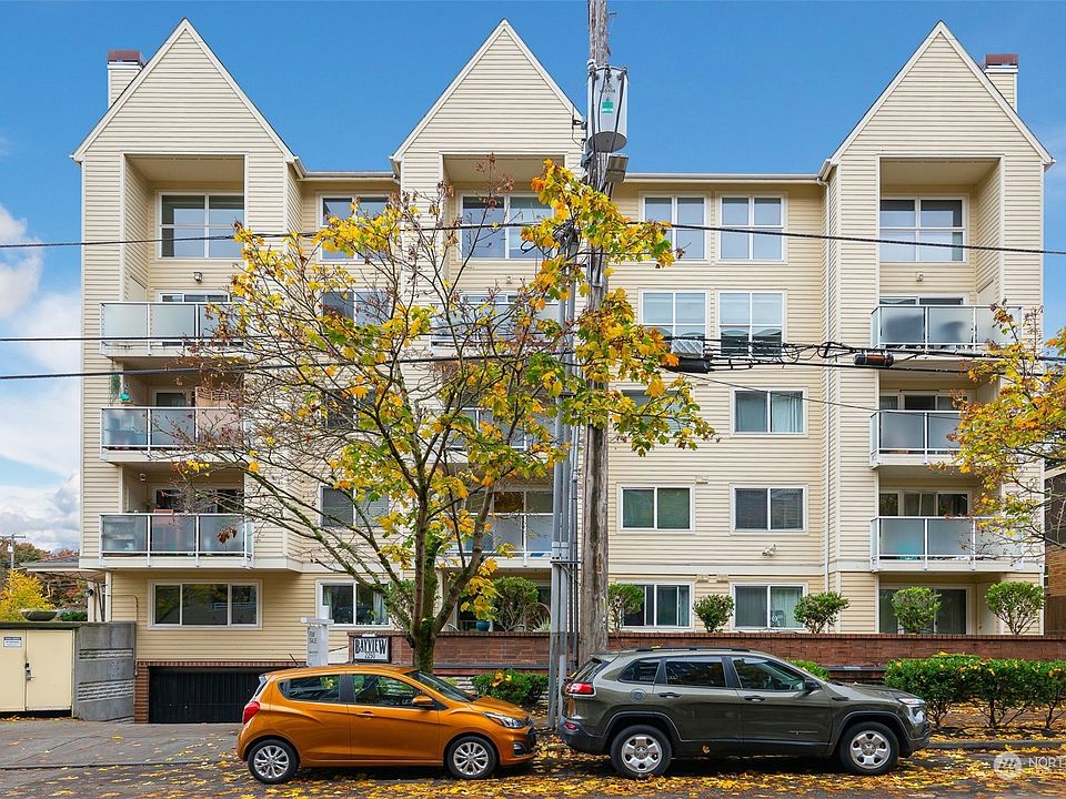 The largest unit in the Bayview, nestled in the heart of Ballard - this 2 floor unit features a thoughtful & open floor plan that lives large. Private and peaceful with 20” vaulted ceilings & picture windows facing trees, large living room & fireplace, kitchen with a roomy pantry & all brand-new appliances. Both bedrooms are spacious, the primary with a walk-in closet. Ample storage inside + 2 large storage closets on balcony. Located a few blocks from historic old Ballard where you can enjoy the year-round farmers’ market on the cobblestone Ballard Ave. Close to numerous restaurants, Golden Garden park, Ballard locks & much more!  Freshly painted. Two parking spaces in secured parking garage. Laundry in unit. No rental cap. Walk score 98.