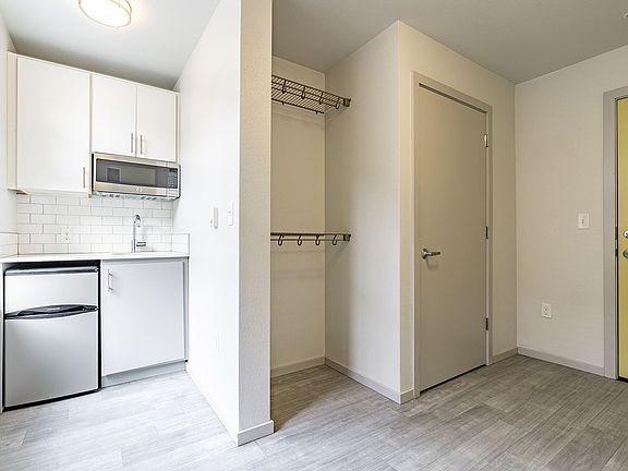 Looking for an affordable and efficient studio in a fabulous location? Look no further! Alcove Northwest offers studios perfect for minimalist living. Each studio is about 160 SF and has a private bathroom, built-in closet, microwave, small fridge, complementary Wi-Fi, luxury vinyl tile flooring, two sinks, and cabinet space. The building offers community kitchens with ovens and stoves, as well as complementary bike storage.
