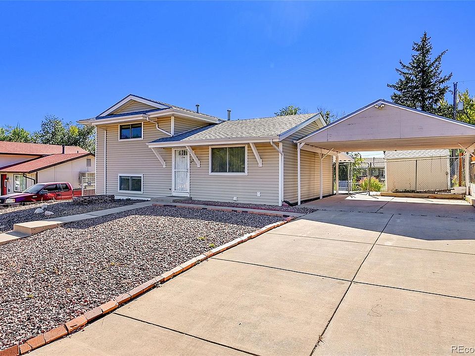 Pikes Peak Park-Traditional tri-level with 3 bedrooms, 2 bathrooms. Close to shopping and parks and all that Colorado Springs has to offer. Available for a quick move in. Recently refreshed, with new paint throughout. Updated kitchen and bathrooms. The large living room opens to the dining and kitchen. Hardwood floors and ceramic floors for easy clean up. On the top floor are 2 bedrooms and a full bathroom. The lower-level features new luxury vinyl plank floors. Enjoy easy outdoor living with Xeriscape front and back yard. Fully fenced yard with a shed. Plenty of parking in the oversized driveway, and carport. The home has newer windows, has been freshly painted throughout, and has upgrades in the kitchen and bathrooms. Enjoy the recent xeriscape in the front and back yard. Fully fenced back yard that includes a shed. Plenty of parking in the oversized driveway and attached carport.