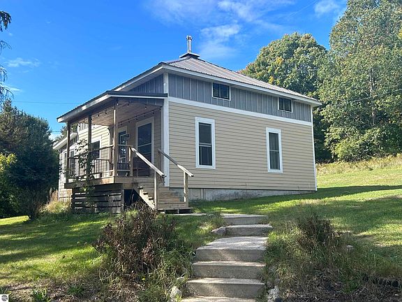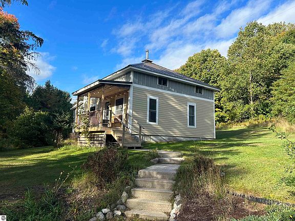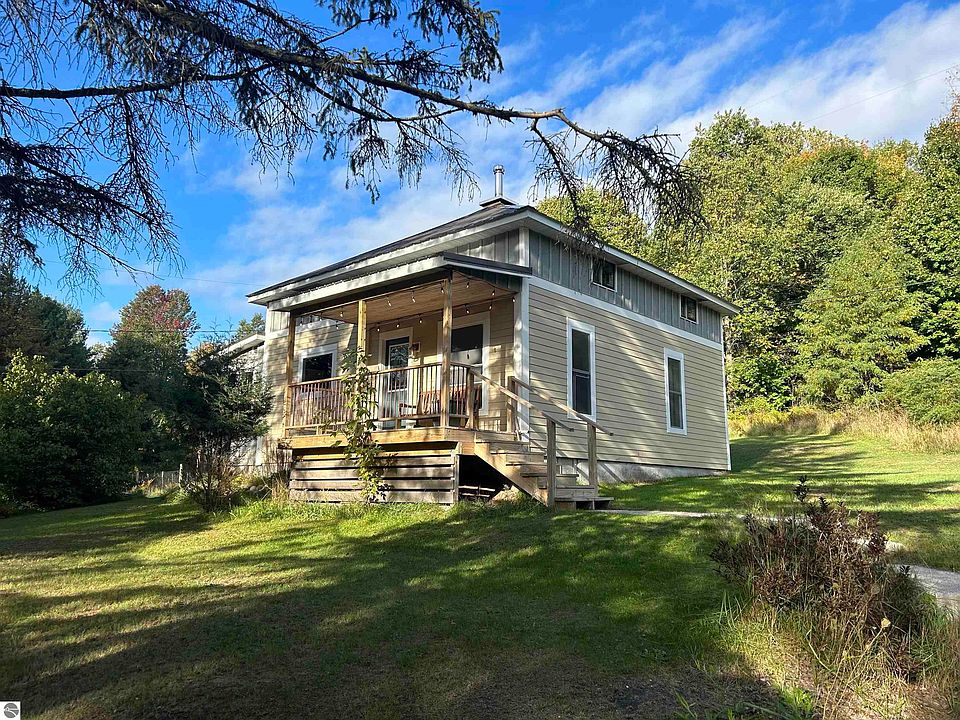 Charming stylish home tucked into Benzie county countryside on 9 acres of land yet only a stones throw away from town. Included on the property is a brand new office studio building. Your front covered porch is the perfect place to enjoy country living. From your back yard, take a stroll in the woods where you will find the newly built detached chic studio; present owner used it as an office. Wood floors, trim and accent walls make this home feel cozy and charming.