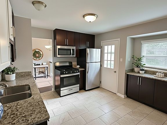 This inviting 3-bedroom, 2-bathroom split-level home offers a bright, functional layout with thoughtful updates throughout. Tucked away on a quiet street, the home features a durable brick and vinyl exterior and a spacious 2-car garage for added convenience. Step inside to a generously sized living area filled with natural light from oversized windows. The adjacent dining area features sliding glass doors that lead directly to a concrete backyard patio, perfect for outdoor meals or relaxation. The gorgeous tile kitchen is outfitted with modern appliances, a gas stovetop, dishwasher, granite countertops, and a bar-height seating area with views of the backyard-ideal for both everyday living and entertaining. Upstairs, you'll find fresh carpet, ceiling fans in every bedroom, and a comfortable layout with ample natural light. Both bathrooms are well-positioned to serve guests and residents alike. With its bright interior, updated finishes, and quaint location, this home is a great fit for buyers seeking turnkey value and long-term comfort.