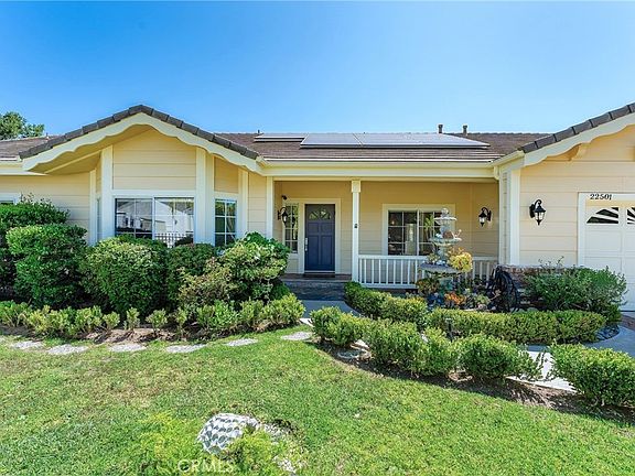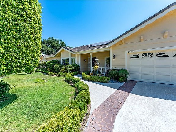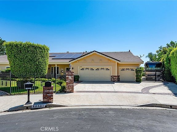 Sprawling single story upgraded estate privately situated at the very end of a quiet cul-de-sac of only 5 homes in one of the most desirable neighborhoods in Chatsworth. Located on an impressive 18,000+ SF flat lot, the property features superb curb appeal with nicely landscaped front yard, 3-car garage with large finished attic and built-in storage, & additional extra wide gated driveway perfect for RV/boat/extra parking for large gatherings. A covered front porch greets you before stepping inside the double door entry. The grand foyer opens to both a formal living room with vaulted ceiling as well as a separate formal dining room with tray ceiling, open shelves, & real hardwood flooring found throughout. The stunning completely remodeled open kitchen boasts gorgeous quartzite stone counters, center island with breakfast bar seating, stainless Cafe appliances including double ovens & 6-burner stove with pot filler, & walk-in pantry with built-in storage & pullouts. The kitchen opens to a separate family room with soaring wood beamed vaulted ceiling & stone fireplace. An additional sunlit bonus room located off the family room features wall-to-wall picture windows, two sets of glass sliders that open to the yard, & wood beamed vaulted ceiling. There are 5 spacious bedrooms including the primary suite featuring high vaulted ceiling, walk-in closet with additional wardrobe closet, & private en-suite upgraded bathroom with dual sinks, quartz counters, bath tub, walk-in shower, & separate toilet room. Two of the secondary bedrooms are massive suites, each with walk-in closets that share an oversized bathroom with dual vanities, tub, shower & built-in linen storage. The 4th bedroom has an en-suite bathroom with dual sinks, tub & shower. The 5th bedroom is located on its own wing of the house ideal for guests with access to its own upgraded bathroom. Additional living spaces include craft room/office, laundry room, & guest powder bathroom. The incredible park-like backyard is an entertainer’s dream featuring large grass lawns with walking path, covered patio with built-in heaters & fan, BBQ center with two grills & sink, above ground spa, & numerous fruit trees including grapefruit, Meyer lemon, blood orange, & plum to name a few. Huge energy savings with completely paid for solar panels. Located adjacent to horse trails, hiking, parks, dining/shopping at the Westfield Mall/Village, & easy access to the 118 freeway. Don’t miss this spectacular offering!