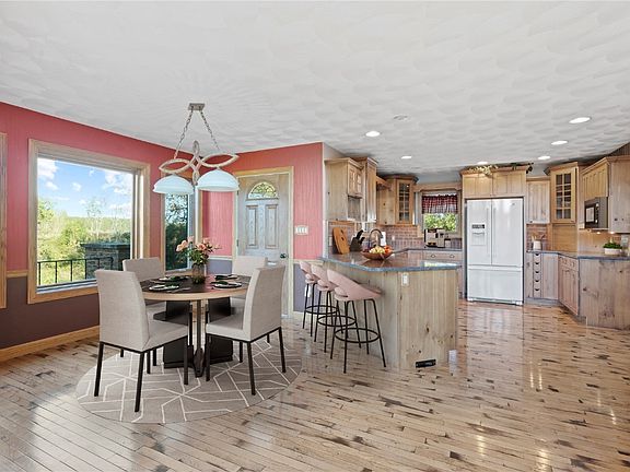 This stunning 11-acre custom property with water access offers the perfect blend of rustic charm and Tuscan elegance. The beautiful brick home features stone fireplaces and exquisite craftsmanship throughout. The primary suite is a luxurious retreat with glass shower and jetted tub, You'll love the vaulted ceilings and breathtaking views, complemented by rich hardwood flooring. No detail has been left unturned, from the massive 45 x 70 heated and insulated shop, fully equipped with a bathroom, and kitchenette, to the small horse barn with a tack room and large pasture. The property is accessed via a solid concrete drive, framed by a grand stone archway. Perfect for nature lovers, the scenic trails are ideal for side-by-side rides, and you can kayak right to your own back door. Sit out on the deck and take in the serene water views, making this home a true outdoor paradise.