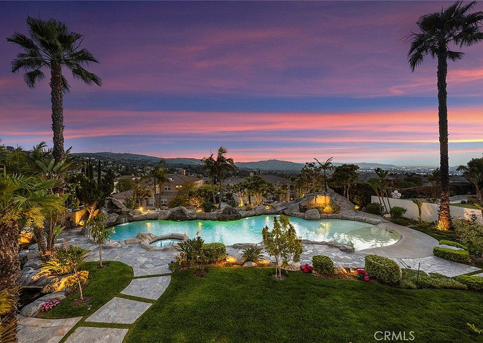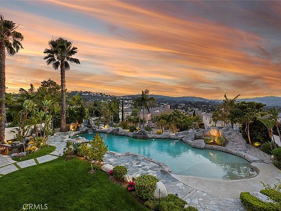 This ultimate masterpiece estate, remodeled and updated in 2023, enjoys over $900K in upgrades; it spans 5,618 sq ft of perfection, and is nestled amidst the serene landscape of the exclusive guard-gated community of Hill Top (with only 48 homes). Located on over half an acre, with sweeping city light views, this grand semi-custom estate offers an unparalleled fusion of opulence and tranquility. Step through the custom grand front doors into a world of refined elegance and natural light. The entry foyer welcomes you with its soaring ceilings and sets the tone for the lavishness that awaits. Completely upgraded throughout with a gourmet kitchen that is a culinary masterpiece, equipped with top-of-the-line Thermadore stainless steel appliances, 3 built in columns: 36” refrigerator, 24” wine and 30” freezer, large center island that doubles as a breakfast bar, and is highlighted with a $7K kitchen faucet. There is also an additional ice maker, and beverage fridge in the eating area. Off the kitchen is a wall of stackable doors that open to the breathtaking resort style backyard, complete with a huge 5 star hotel size lagoon style beachfront entry pool, Koi pond with romantic viewing bridge, entertainer's BBQ, and exotic fruit trees throughout. Perfect for indoor and outdoor living or entertaining. Flawless, and move-in ready with new flooring throughout the entire home, 4 exquisite chandeliers, 2 enclosed and lighted walls of floating wine bottles (one on each side of the living room fireplace), family room with custom fireplace, huge formal dining room, and 5 exquisite bedrooms; one ensuite is located on the main level and perfect for multigenerational living, or a live-in situation. The primary suite is a retreat in itself with its scenic wrap around viewing deck that overlooks the lush grounds, city lights, and twinkling stars. It is a sanctuary of luxury and comfort. There are 5.5 new luxurious bathrooms (1 outside by the pool complete with stunning shower). This home redefines custom and is second to none! Experience a lifestyle of luxury, relaxation, and sophistication. Immerse yourself in the enchanting surroundings as you lounge by the sparkling pebble tec pool, unwind in the spa, or bask in the sun on the sprawling patio. Enjoy this zen-like romantic property, the meticulously landscaped grounds, and the peace and tranquility creating an atmosphere of serenity. Every detail curates timeless elegance. Cannot be reproduced at this price!