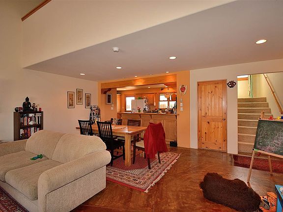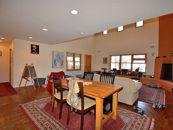 On the Santa Fe River Trail, behind Frenchy's Park, this spacious home has soaring ceilings and clerestory windows, Kiva fireplaces, radiant heating and stained concrete floors. It has three large bedrooms with carpet in 2 of them. Two of the bedrooms are en suite with views to the mountains. The large master bedroom has a great walk-in closet and the bathrooms is tiled with double vanities, separate shower and jetted tub. There is a large loft overlooking the Great Room that is great for office, play or media space. The landscaping is low maintenance. This is a great, HOA free neighborhood, just 4 miles from the Plaza and the trail to town is a plus. Priced below appraisal.