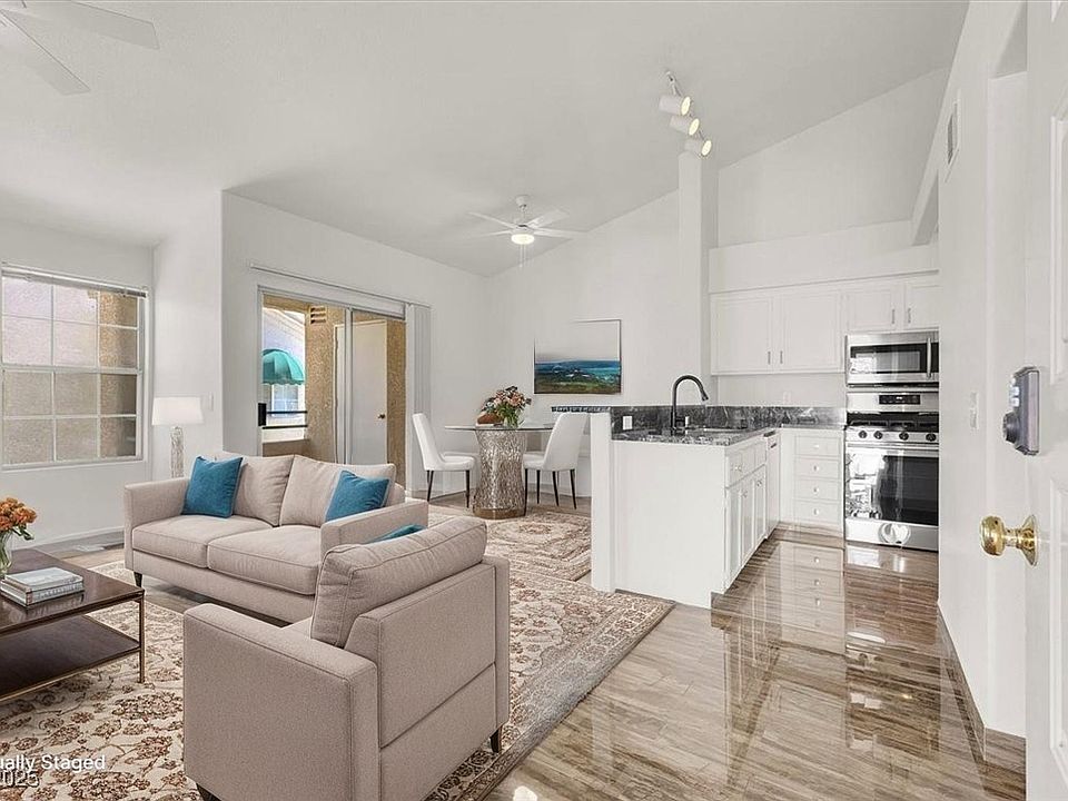 Rare Find in Green Valley! This beautifully maintained 3-bedroom condo offers fresh paint and numerous upgrades throughout. Step into the bright upstairs unit featuring sleek quartz countertops, a cozy fireplace, and stunning stainless-steel appliances along with an upgraded washer and dryer. Enjoy the convenience of a detached one-car garage plus an additional assigned parking space. The community boasts three sparkling pools and is ideally located near shopping, dining, and freeway access. New ceiling fans add the perfect finishing touch! This home is move in ready, schedule your showing today!
