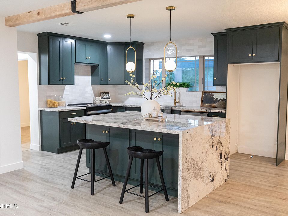 The gourmet kitchen features striking bluezonite granite countertops, an oversized waterfall island, and custom cabinetry. Light, open living spaces are enhanced by modern flooring, fresh paint, and updated fixtures throughout.