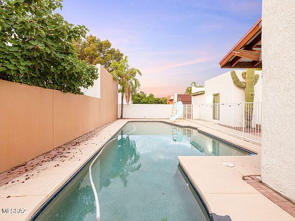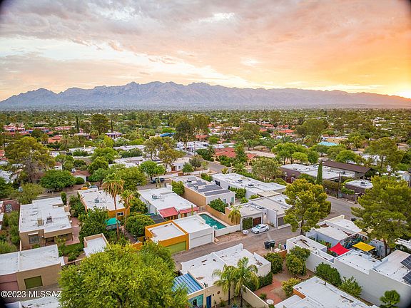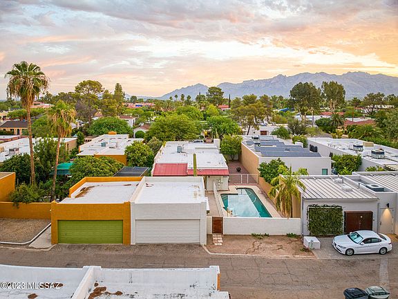 Fantastic opportunity for 1,965 Sqft 3 bed/2 full bath plus enclosed Arizona room, shimmering pebble tec pool, finished 2 car 564 SqFt garage, all electric 1977 southwest contemporary home on private .18 acre R1 lot, no HOA, located in designated historic Blenman Elm neighborhood walking distance to the historic Arizona Inn, U of A, Banner Medical, Himmel Park, minutes to thriving downtown Tucson and quick access to I-10. Featuring N/S orientation, mountain views, on and off street parking (plus alley parking), concrete sidewalks, custom metal gated access to low care front yard. Enter through original double wood doors to spacious living room with tall 9' textured painted ceilings (no popcorn), energy efficient double pane windows, copper plumbing, grounded electrical, 200 amp electric panel, vintage saltillo flooring and recently installed luxury vinyl plank in 2 bedrooms (no carpet!), wood burning fireplace, 5 skylights, illuminated ceiling fans, interior stacked laundry closet, washer/dryer included and rounded archways leading to formal dining room adjacent to living room. Enjoy modern updated open concept kitchen with full slab granite counter tops, bar seating, recessed lighting, updated mahogany kitchen cabinets with soft close feature, stainless steel appliance package including dishwasher, built in microwave, stove, fridge with closet pantry and additional bar seating/work station adjacent to family room. Spacious guest bedrooms with new luxury vinyl plank flooring and the walk in closets handle your storage needs. Updated guest bathroom with executive height Corian countertop modern vanity, exhaust fan and matching Corian shower/tub. Retreat to primary bedroom, boasting rare white saltillo flooring, private ensuite full bathroom with matching Corian executive height modern vanity, Corian shower/tub, walk in closet and slider leading to private backyard. Enjoy tranquil Tucson nights from your enclosed covered Arizona room, a perfect place to entertain or catch an afternoon siesta. Cool off in the refreshing pebble tec lap pool, sand filter, variable speed pool pump complete with water slide, sewer clean outs, roof recoated July 2023, wrought iron pool fencing surrounded by stucco masonry privacy walls.