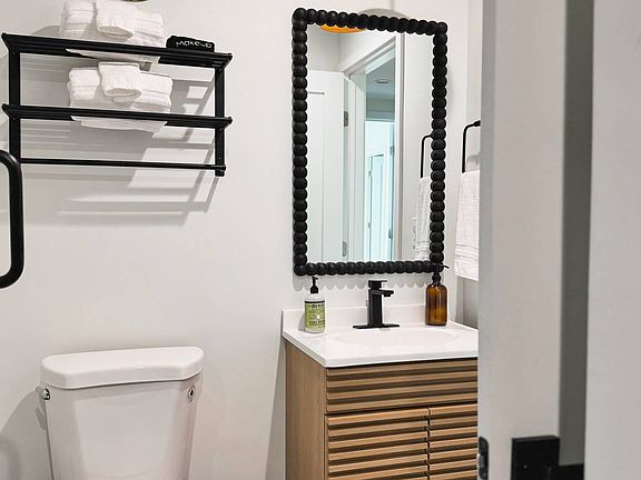 Living room: Enjoy the open-concept living room, designed for comfort and style. Relax on a luxurious blue velvet couch that easily converts into a full-size sleeper sofa, offering additional sleeping space. With ample seating for everyone, gather around the large TV to watch movies, sports, or your favorite shows. Family games are conveniently stored below the TV, perfect for an evening of fun.