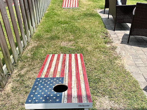 There is also a half bath and laundry room downstairs. The garage has been turned into a fun game room, offering foosball, darts, a 65" TV and seating.