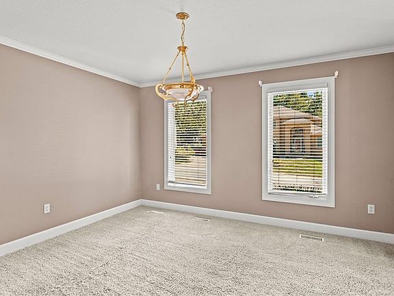 The kitchen is a chef’s dream with abundant cabinet space, a central island, sleek black appliances, and room for casual dining. Wood blinds throughout the home offer timeless style and privacy, while the central vacuum system adds convenience to everyday living.