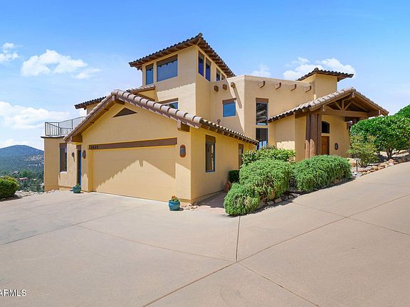 VIEWS, VIEWS, VIEWS. Discover a captivating fusion of rustic southwestern Territorial, Mission, and Santa Fe architectural styles in this stunning Sun Pine Homes' custom-built masterpiece. In business since 1982, Sun Pine Homes ''specializes in both the design and the construction of energy efficient, sustainable custom homes that maximize views and blend into the environment, integrating boulders, trees and other natural elements.'' This home has been carefully sited and designed at every level to showcase the breathtaking vistas of Granite Mountain. Situated thoughtfully on the west side of Pinnacle Mountain and overlooking the expanse of Shadow Valley, the design maximizes views while maintaining a compact hillside footprint. Upon entering this warm and inviting abode, you're immediately greeted by an expansive 18-foot-high wall of glass in the great room, framing a panoramic view of Granite Mountain and the Sierra Prietas, all managed as part of the Prescott National Forest. The main floor features the great room, dining area, and kitchen, all adorned with abundant wood windows to capture the scenery. A second bedroom, versatile as an office/den, a laundry room with utility sink and storage cabinets, and the master bedroom complete the main level. One floor living is definitely possible with this creative design! The private master suite, strategically positioned for privacy while boasting the same majestic views you find in the great room, includes a full glass French door opening onto a spacious patio with serene dual-sided waterfalls, perfectly situated to enhance the amazing vistas. Ascending the handcrafted staircase to the second floor, a library and two additional bedrooms await. The library opens onto a large, partially covered deck offering stunning views of Thumb Butte and the Bradshaw mountains. Connected to the library is a third-floor observatory, featuring a wet bar and surrounded by wood windows that provide unparalleled 360-degree views. Step out onto the observation deck, surfaced with Brazilian hardwood, for an awe-inspiring experience. Throughout the home, the fusion of architectural styles creates a territorial fortress ambiance, highlighted by wood accents, exposed beams, headers, Vegas, and rafter tails against a backdrop of smooth rounded stucco. Inside, rustic wood poles, heavy tile, and distressed pine custom cabinets further enhance the distinctive charm of this exceptional residence. Experience the true essence of mountain living in this meticulously designed and impeccably well-maintained home where every detail harmonizes with its natural surroundings, offering both tranquility and expressive architectural distinction.