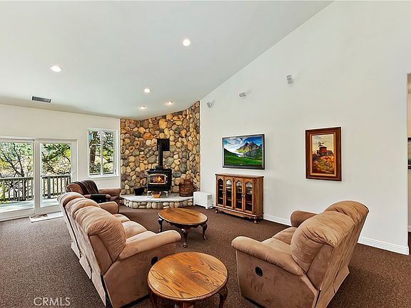 Custom built home in Crestline's best kept secret neighborhood! Situated on nearly three quarters of an acre with mature fruit trees that backs up to national forest property, this home will suit even the pickiest of buyers. Just one easy step into the home one will note an open concept living room/ kitchen/ dining area with stunning high ceilings. A gorgeous wood burning fireplace is located in the living room, perfect for gathering around during the winter months. A large entertainers deck is located off the living room. The kitchen is appointed with granite counter tops, a high-end Jenn-Air chef's stove, microwave drawer and food pantry. Located off of the kitchen is a mudroom that features an appliance pantry, coat closet and a large laundry room with a sink. A huge family room is located above the two car garage with plenty of space for the kiddos toys. Walking down the hallway off of the kitchen is two ample sized guest bedrooms with a full bath in between the two rooms. The primary suite is located on the other side of the home which features a gas stove, ensuite bathroom complete with a jacuzzi tub, dual shower, as well as walk-in closet. The fourth bedroom (currently being used as an office) is located off of the main living area. The lowest level of the home boasts a massive game room, the third and final three piece bath, and is plumbed for a wet bar. Located on either side of the game room is single car garage- one is currently being utilized for storage while the other is being utilized as a workshop. Did I forget to mention the RV garage? You cannot forgot that! In addition to the RV garage, this home has a whole house automatic transfer switch generator, ev charger, zoned heating, central vac system, bose sound system and 50 year presidential roof! One cannot help but notice the attention to detail and quality of this home, call your agent to schedule a private showing today.