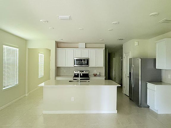 The move-in ready 4 bedrooms, 2 bathrooms home just steps away from the amenity center with community pool with cabana, open green spaces and a community playground. An open concept kitchen, cafe and gathering room, a covered lanai, 2-car garage, window blinds, washer, dryer and refrigerator. Spectrum Gigabit High-speed Internet and TV are included.