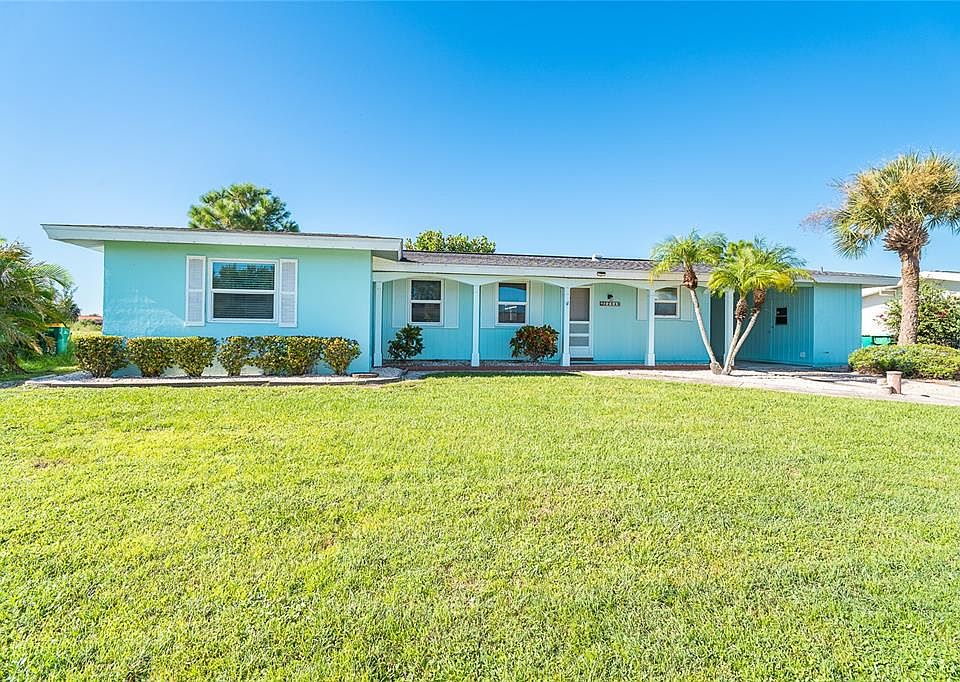 One or more photo(s) has been virtually staged. Located on a quiet street, this charming 2-bedroom, 2-bath pool home blends a retro mid-century vibe with thoughtful updates and has been beautifully maintained. The open floorplan extends into a Florida sunroom, adding extra living space filled with natural light, while the backyard overlooks what was once a golf course and is now open greenspace, offering privacy and a peaceful natural backdrop. Major updates provide peace of mind, including a new roof in 2020, HVAC system in 2025, and hot water heater in 2021. Nine impact windows were installed in 2021, with the lanai sliders remaining original but paired with convenient pull-down shutters. Inside, the home has been freshly painted with all tile floors cleaned and sealed, featuring terrazzo and ceramic tile throughout for a low-maintenance lifestyle. The kitchen is both functional and private, with a built-in oven and ample cabinetry that keeps the mess tucked away when entertaining guests. The spacious primary suite comfortably fits a king-size bed and includes a walk-in closet and private bath with a walk-in shower, while the guest bath is also generously sized with excellent storage. Outdoor living shines with a sparkling pool, newly rescreened cage, stamped concrete decking, and plenty of room for dining, lounging, or enjoying the sun. The pool pump was replaced in 2025, adding to the long list of completed improvements. Additional storage and laundry space are located just off the carport, providing room for your washer, dryer, and more. In desirable Flood Zone X, this property requires no flood insurance and has no history of claims, plus there are no HOA fees. Conveniently located near schools, shopping, restaurants, golf, fishing, and hospitals with quick access to I-75, the home is just 30 minutes to the beaches of Manasota Key and Boca Grande and close to the new Sunseeker Resort, Downtown Punta Gorda, and Fisherman’s Village. With everything already done, this home is move-in ready so you can start enjoying the Florida lifestyle right away.