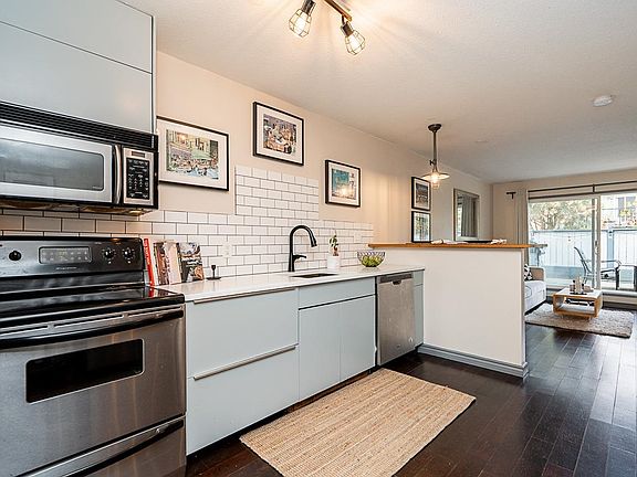 Welcome to this great 1 bed 1 bath Nicely updated Fully rainscreened perfect for entertaing unit. S/S appliances, New quartz counter tops, New backsplash, New Washer/Dryer, Newly painted, Walk in closet, office space and last but not least, almost 250sqft of private outdoor space. Enjoy the outdoors all year round with a peekaboo view of the ocean. Rainscreened in 2004 (Hardi Plank and Vinyl) this building is in great shape. Situated on a peaceful quiet street and in walking distance of Restaurants, cafes, shopping and parks. Parking, Storage but No dogs. Don't miss out as this is one of the special ones. Open Sunday Sept 14 1-3pm.