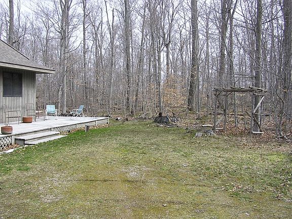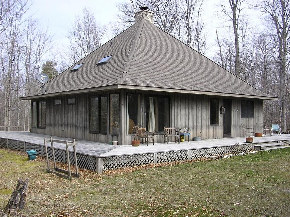 Nestled in the woodland you'll find this unique home. Surrounding windows maximize the ever-changing views nature provides. No matter the season, each day will provide the soothing serenity that this home and property provide. The open kitchen, dining and living room are inviting for an area to gather and entertain. The main focal point is the floor to ceiling fireplace of Island fieldstone. Imagine the welcoming delight of a crackling fire to take the chill off while the snow falls lightly outside. The home features a master bedroom suite w/master bath, plus a second bedroom and full bath on the main level. The upper level loft provides expansive space, currently used for added sleeping area. It could also be used for other purposes.