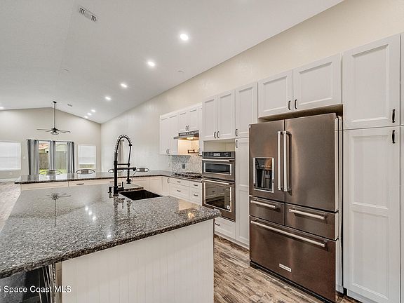 Center islandGranite countertopsOpen floor planAmazing rocket launch viewsLvp flooringLarge remodeled kitchenStainless steel appliances