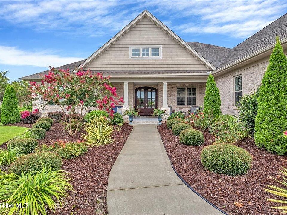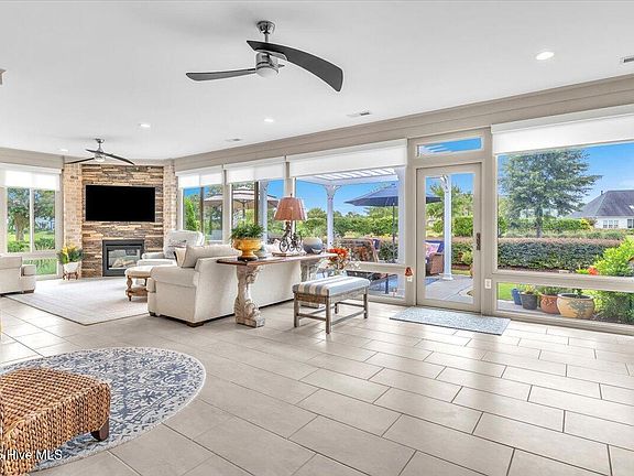Presented for sale is this stunning executive home built by Coastal Luxury Homes, crafted for the discerning buyer. Thoughtfully designed and perfectly positioned along the par-3 8th fairway of the Rick Robbins Championship golf course, this home offers breathtaking tee-to-green and pond views every day. Located on a beautifully landscaped 1/3-acre lot in the prestigious Compass Pointe community, this light-filled, custom-built home exudes luxury. From the meticulously maintained split floor plan to the exquisite finishes, every detail has been carefully considered. Exterior curb appeal is unmatched, with professionally designed landscaping, lush greenery, and a no-outlet street that offers peace and privacy. Inside, you'll be immediately impressed as the open foyer reveals a direct view through the living room's stacked stone fireplace and out the telescoping glass doors to the expansive 736 sq/ft heated and cooled lanai. The chef's kitchen is a showstopper, featuring a massive quartz island, custom cabinetry, Kitchenaid appliances, gas range, wall ovens, Bosch refrigerator, Zephyr hood, tiled backsplash, under-cabinet lighting, and soft-close drawers with cabinet rollouts. The living, dining, office, and breakfast nook areas showcase custom built-ins, detailed moldings, and coffered ceilings, all framed by panoramic golf course views. Retreat to your private 312 sq/ft master suite, where you can relax in bed while enjoying views of the SECOND stacked stone fireplace and direct access to your spacious lanai through the French doors. The luxurious master bath includes dual granite vanities, two walk-in closets, and a zero-entry tiled shower. The 4-season room is a true highlight, with telescoping doors, tiled floors, a stacked stone fireplace, and a wall of windows that seamlessly connect the indoors to the beautifully landscaped exterior. For those who enjoy outdoor living on those cool Carolina days, the large patio with pergola and gas/electric hookups offers the perfect space for entertaining or quiet relaxation.
