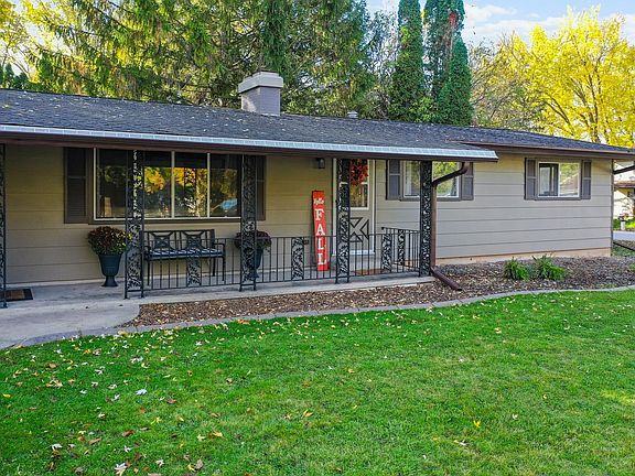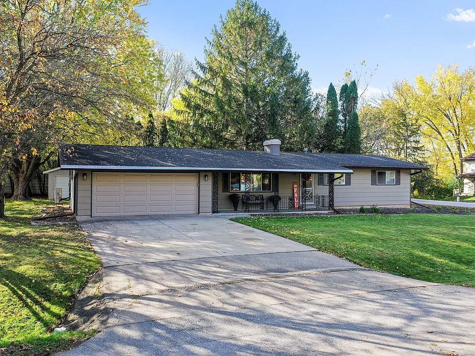 Charming open-concept ranch on a corner lot greets w/ cathedral ceilings & stone-faced wood-burning FP. Dining area w/ sliding door opening to covered porch & deck. Kitchen w/ isle, appliances & walk-out door to deck. Easy-care plank flooring throughout home. Main bathroom w/ updated vanity & fixtures central to all bedrooms. Lower level adds 765 sqft composed of a spacious fam-room w/ wood-stove, cozy den, office/storage room all w/ unfinished walls and half-bath. Laundry & mechanical room boasts a new water-heater (2025) & sump-pump. 2-stall attached garage w/ newer garage door (2022), with bonus detached garage & shed behind home. Gutter guards added 2025.