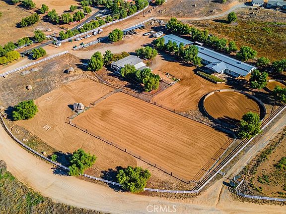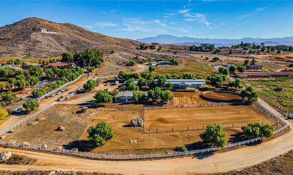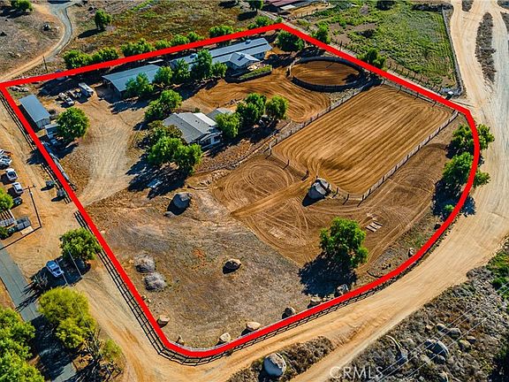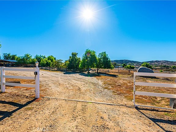 CHECK OUT THIS IMPECCABLE WORKING HORSE RANCH IN THE DESIRABLE HORSE COMMUNITY OF GAVILAN HILLS! Drive through the GATED ENTRY opening up to a perfectly manicured 4.17 ACRE "IMPROVED" HORSE PROPERTY including a turnkey Manufactured Home (on permanant foundation) & detached, insulated 2 CAR GARAGE/WORKSHOP/GUEST UNIT. Imagine enjoying the AMAZING VIEWS of the mountains & valley while sipping morning coffee on the front porch. Move right into this lovely single story home featuring front & rear covered patios, neutral tones w/open floor plan, NEW HVAC & Condenser, NEW security screens, ceiling fans throughout, vaulted ceilings, plenty of storage & large rooms. Includes open Kitchen w/stainless appliances & Breakfast Nook, Family Room w/fireplace, separate Dining Area, indoor Laundry Room & spacious Primary Bedroom w/his & her mirrored wardrobe. Includes large Primary Bath w/soaking tub & dual sinks. This amazing property also includes a FULLY FENCED (upgraded Vinyl w/wire mesh), 100% useable lot w/4 separate yards including dog yard & goat pen. For my fellow HORSE ENTHUSIASTS, check out the 6000 SQ. FT.(apprx) BARNMASTER BARN w/16 ft. wide breezeway & 18 ft. high ceiling that can convert to a 20 STALL BARN (currently has 13- 12'x12' stalls, 2 w/16'X24' & 1 w/16'X44' NEW PIPE CORRALS W/WIRE MESH RUNS, 5 stalls have rolling walls that convert to 12'x24' foaling stalls, stall fans, stall storage cabinets, 12'x24 FINISHED' "TONGUE & GROOVE" TACK ROOM, 12'x12' ENCLOSED FEED ROOM w/ 1/2 Bath, GROOMING BAY, ENCLOSED STORAGE, OPEN STORAGE, open foyer leading to 12'X24' FINISHED "TONGUE & GROOVE OFFICE W/tile flooring & covered porch that amplifies the amazing views & overlooking the main Arena). ALSO, features 8 STALL- 16'X16' FULLY COVERED MARE MOTEL W/16 ft. breezeway, 72 FT. SHEDROW STYLE SHELTER/CARPORT, WASH RACK, 50 FT. SIDED ROUNDPEN (apprx), additional 90 FT. ROUNDPEN (apprx), footed 200' X 108' ARENA (apprx) & additional space for pipe corrals/pasture turnouts. All this w/low taxes & access to MILES OF LOCAL HORSE TRAILS. This property is a must see!!!