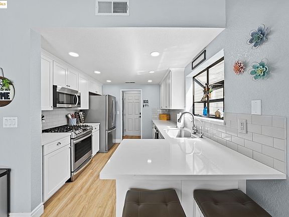 Discover effortless style and comfort in this beautifully updated 2-bed, 2-bath single-story home on desirable Camborne Drive. The 1,220 sq ft of light-filled living space feels expansive thanks to vaulted ceilings and an open-concept flow. The modern kitchen is a chef's dream, featuring quartz countertops, subway tile backsplash, stainless steel appliances, and bar seating that opens to the living and dining areas, complete with a cozy brick fireplace and custom built-ins. The spacious primary suite offers vaulted ceilings and a refreshed ensuite. Outside, relax in the private, low-maintenance courtyard with a charming pergola and concrete patio. This turnkey gem includes central HVAC, a garage fridge, and a prime location with easy access to shopping and freeways, offering the perfect blend of comfort, style, and function.