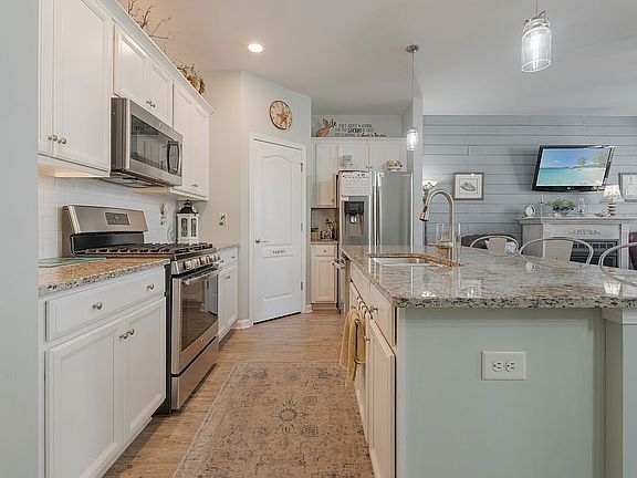 The 13x9 ft. kitchen has a gas range with a grill, microwave, granite counter tops, refrigerator, dishwasher and a walk-in pantry with built in shelves and a breakfast bar.