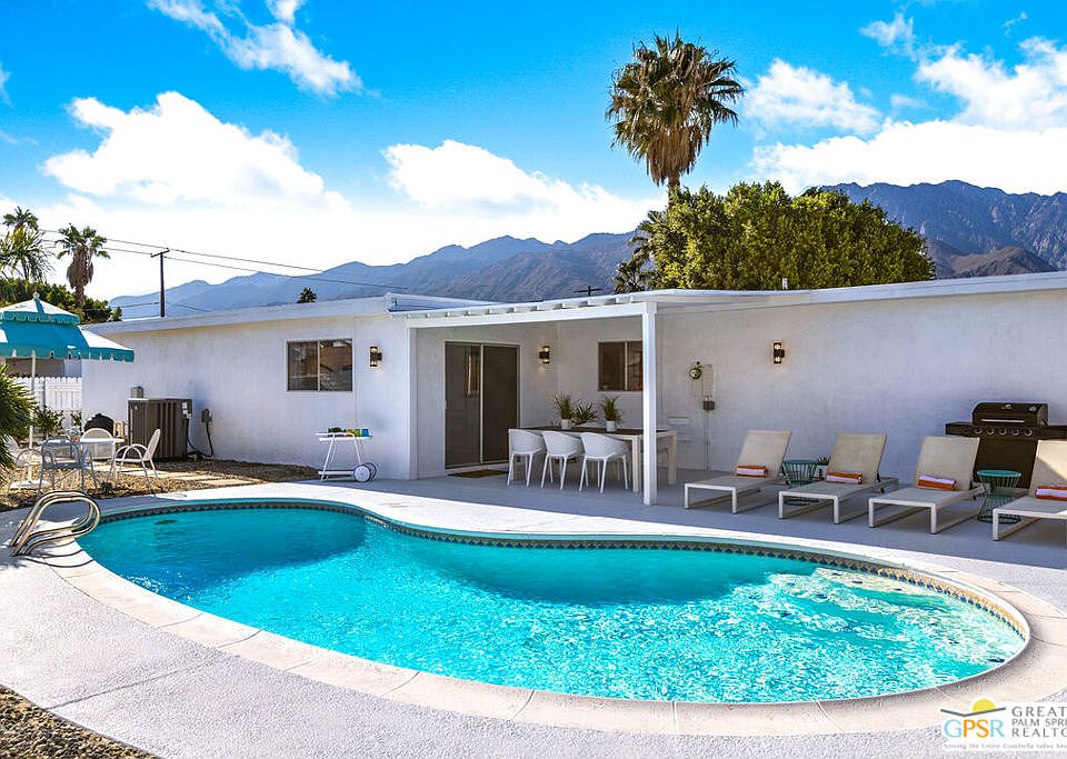 AN AMAZING OPPORTUNITY!! Looking for the perfect TURNKEY desert oasis? This Ranch Club Estates 3 bed/2 bath home is ready to occupy and enjoy the sunny pool, backyard and fantastic mountain views. Offered turnkey furnished (with very limited exclusions), this home is decorated to capture that classic Palm Springs Mid Mod style with bright accents and custom wallpaper. Enjoy the private backyard with pool, covered patio and a new turf area perfect to enjoy the sunset! Extensively renovated including kitchen, baths and a new HVAC condenser (2021). Smart home features include Nest thermostat, Ring floodlight, camera and doorbell. Living room, dining area, separate den and a covered patio provide options for indoor/outdoor entertaining. Tucked away on a lightly trafficked street, the property occupies a large lot with extra space for a possible future expansion or ADU. This home is a successful and active vacation rental when not utilized by the owners. This home is located in the Ranch Club Estates neighborhood when reviewing the city figures for short term rental permits. A complete list of home improvements is included in the Docs section.