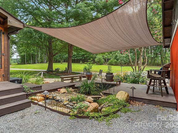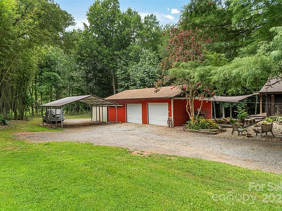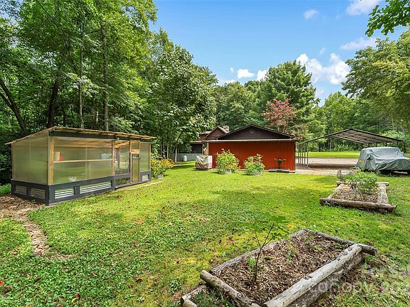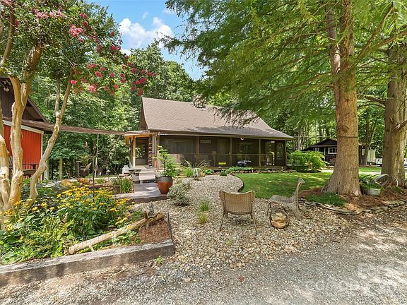 This is how you do Western North Carolina! 3BR/2.5BA log home on 4.95 wooded acres has a 24x48 metal building with 2 garage bays and storage, a 2 car carport, a pretty little storage building that would make the perfect studio, and more. Outdoor living at its best on screened side and back porches (the hanging swing bed stays!), decks, pond and shady spots to sit a spell. Lives like a mountain retreat inside: Kitchen has wormy Chestnut inset Shaker soft close cabinets with pullouts, leathered granite, motion sensor under cabinet/over sink lighting, walk-in pantry. Impressive stone floor-to-ceiling fireplace & cathedral beamed ceilings in Living Room. Main level Laundry Room - Ikea cabinets stay. Primary bedroom with electric blinds, updated bath with Wellfor smart toilet, and office round out main level. Two additional bedrooms and full bath upstairs. Roof replaced 2021, Heat Pump 2023. Septic pumped July 2025. Generator ready.