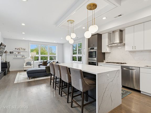 This all-brick, new(er) construction penthouse in Lincoln Square offers the perfect blend of luxury, comfort, abundant natural light and outdoor living. The open concept living and dining area is bathed in natural light, from the south, east and west. It feels like you are in a luxurious secluded treehouse. The sleek kitchen features Bosch stainless steel appliances, double ovens, a waterfall island with seating for four, and ample cabinetry-perfect for both cooking and gathering. The spacious primary suite impresses with a walk-in closet and access to your private deck (also accessible from the hallway). The ensuite bath offers a true retreat with heated floors, dual vanity, and a walk-in shower with body sprays. Two additional bedrooms offer flexibility to suit your lifestyle. Thanks to living on a corner, the middle bedrooms enjoy views of tree-lined Oakley Avenue instead of staring at your neighbors home. A true standout is your private rooftop deck, accessible via your interior staircase. Get ready to relax or entertain friends and family with an outdoor TV, gas line and skyline views! First resale of this luxury home, other features include include 9' ceilings, 8' solid core doors, Hunter Douglas automatic shades, hardwood floors throughout, extra storage (plentiful storage within the home), LG washer/dryer and a garage cage. Prime location with Lincoln Square as well as Andersonville's prime shops and retail minutes away and Winnemac Park down your block. Your day can start by grabbing coffee next door at Cafe Mas, take the dog for a walk in Winnemac Park before heading to Geraldine's Bakery for lemon treats and stopping by Gene's Sausage Shop to grab dinner to grill on your rooftop deck, along with some very local Half Acre and Spiteful Brewery drinks. Western CTA .8 miles. Chappell Elementary.