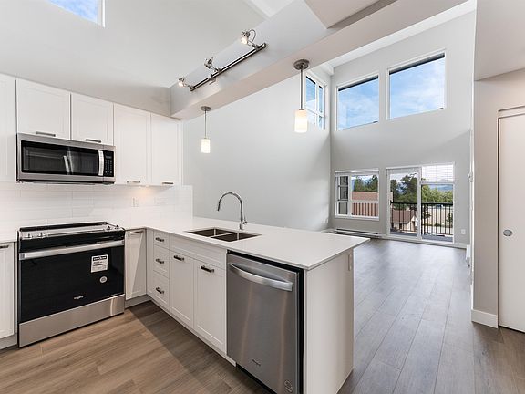 Edge 2, substantially rebuilt 2 bedroom penthouse with loft (1 bedroom on main and another on the loft), 2 full baths with laminate flooring throughout living, dinning and kitchen, and quartz counter tops. SELDOM AVAILABLE 18 ft. ceiling height in living room, dinning room and kitchen. Suite is flooded with day light through extra high windows. Panoramic mountain view and walking distance to elementary school, park, restaurants and shopping. Property comes with one parking and one storage locker.