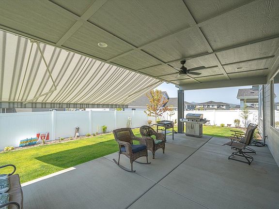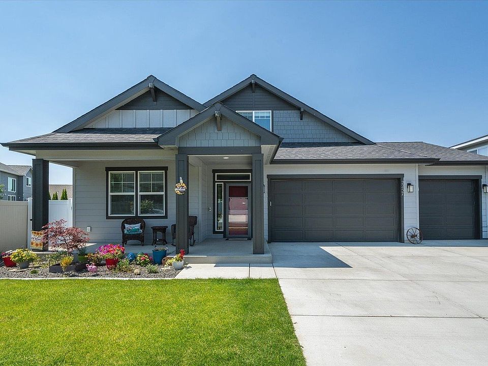 Practically New in Rocky Hill! This charming one level rancher built in 2023 checks all the boxes with a beautiful open plan living design. Fabulous upgrades list includes: LVP Flooring, Quartz counters, stone surround fireplace with built ins, walk in pantry, subway tile & expansive kitchen island & upgraded GE Cafe Appliances. The covered patio with awning is perfect for these warm summer nights. The main floor Primary suite features well appointed bath with quartz counters, dual sinks & amazing walk in closet w/ California Closets. The bonus upper level/guest suite has full bath & California Closets. Oversized 3 car garage with heater & epoxy coated floor & built-ins. Landscaped fenced backyard with add'l fenced off area perfect for dog run/storage! Gardeners dream w/ Apple Trees, blueberries & more! This home is move in ready and is situated in the wonderful Rocky Hill Community with trails, tennis courts, parks & numerous outdoor activities. Only 20 mins to Coeur d'Alene, Airport & Downtown Spokane.