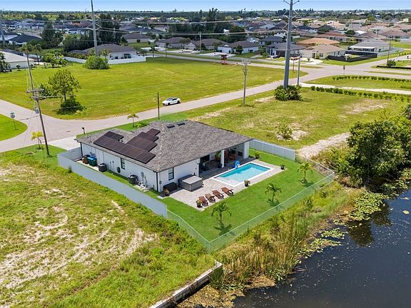 Welcome to this beautifully designed 3 bedroom + den, 2 bathroom pool home, offering nearly 1,900 sq. ft. of living space in the desirable SW Cape Coral area. Built in 2023, this home feels brand new and is packed with upgrades. Inside, you’ll love the open-concept floor plan featuring all-tile flooring throughout, tray ceilings, and impact-resistant windows and doors. The kitchen is perfect for entertaining with quartz countertops, stainless steel appliances, and a large center island. The primary suite includes dual walk-in closets, double sinks, and a modern walk-in shower. Step outside to your private oasis with a heated pool, above ground spa and paver deck, all within a fully fenced yard for privacy and relaxation. Solar panels are installed to save you money on your electric bill! The home also offers a spacious paver driveway, two-car garage, city water and sewer, and the peace of mind of assessments paid in full and no flood zone insurance required.